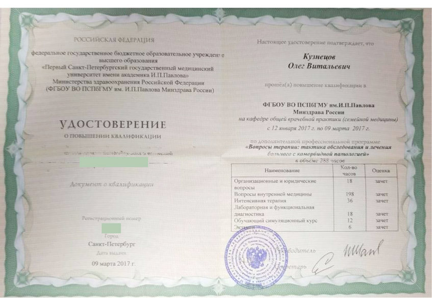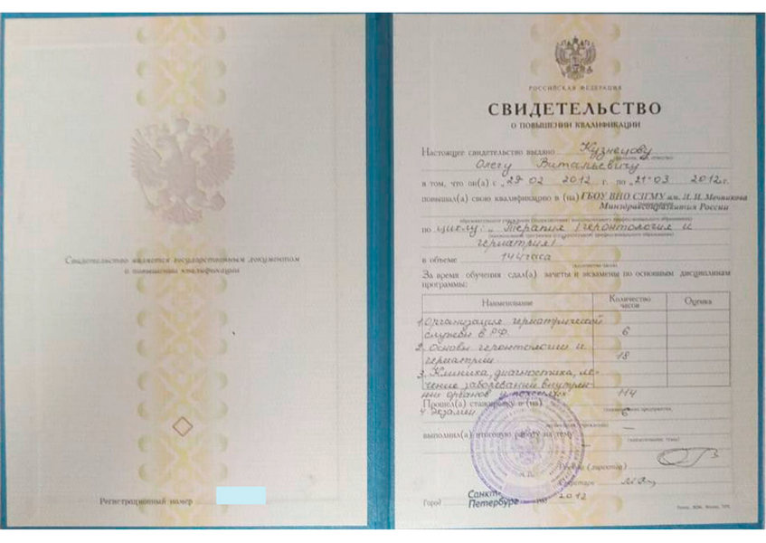 - 2012 – цикл «Терапия (геронтология и гериатрия)» (СЗГМУ им И.И. Мечникова)