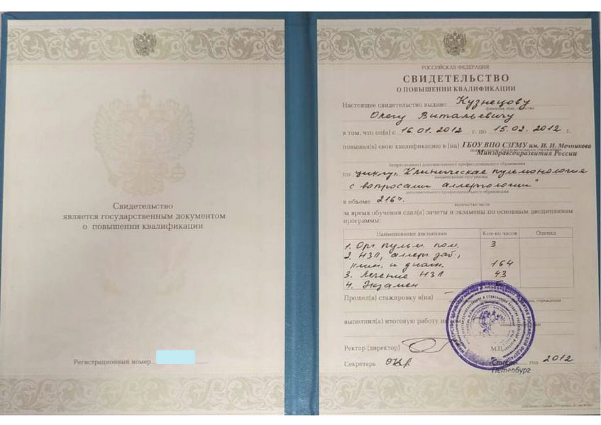 - 2012 – цикл «Клиническая пульмонология с вопросами аллергологии» (СЗГМУ им И.И. Мечникова)
