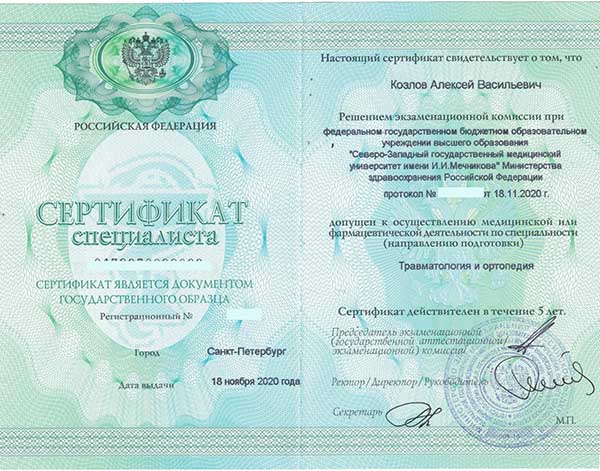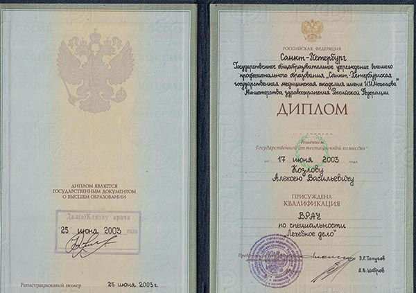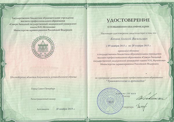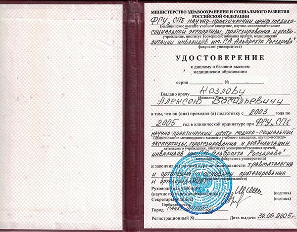 Козлов Алексей Васильевич в 2003 году окончил СЗГМУ им. И.И. Мечникова по специальности «Лечебное дело». Ординатуру прошел при Федеральном научном центре реабилитации им Г.А. Альбрехта по специальности «Травматология, ортопедия, протезирование».