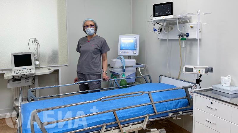 В палате находятся две функциональные кровати, у каждой - инфузионная стойка со шприцевыми насосами для точного дозирования лекарств. Над кроватями установлены консоли с медицинским кислородом и вакуумом. Мониторы на консольных полках отслеживают состояние пациентов.